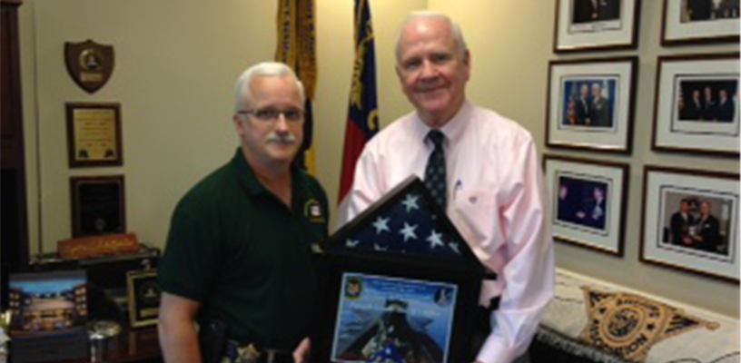 On Tuesday, May 31st, Sheriff William T. Schatzman and the Forsyth County Sheriff’s Office (FCSO) were presented with a flag that was flown in support of “Operation Inherent Resolve” combat mission in Southwest Asia. Detention Officer R. S. Haynes requested the honor. The flag was placed in honor of the FCSO and its employees for their unending service to the citizens of Forsyth County. Detention Officer Haynes was deployed in 2015 and served as Security Supervisor and Fire Team Leader.