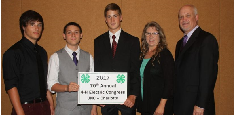 A delegation from Forsyth County attended the 70th Annual 4-H Electric Congress July 11-13 at the University of North Carolina Charlotte. 155 4-H’ers, adult leaders and North Carolina Cooperative Extension agents from 47 counties attended the three-day event. Since 1947, Duke Energy and Dominion Energy have sponsored the annual congress to emphasize electrical energy concepts, conservation, and safe efficient use. The 4-H electric program is one of the most popular activities among Tar Heel 4-H’ers. The 4-H program is the youth education program of N.C. Cooperative Extension, based at North Carolina State and North Carolina A&T State universities. More than 232,000 young people between the ages of 5 and 19 participate in North Carolina 4-H activities each year with the help of 20,563 adult and youth volunteers. Pictured from left are Zechariah Crawford (16) and Noah Crawford (14), sons of Kathleen Litman of Kernersville and Shannon Crawford of Hickory; Austin Wise (16), son of Benny and Karen Wise of Westfield; Karen Wise, 4-H Volunteer and Wayne Huddleston, Account Manager with Duke Energy.