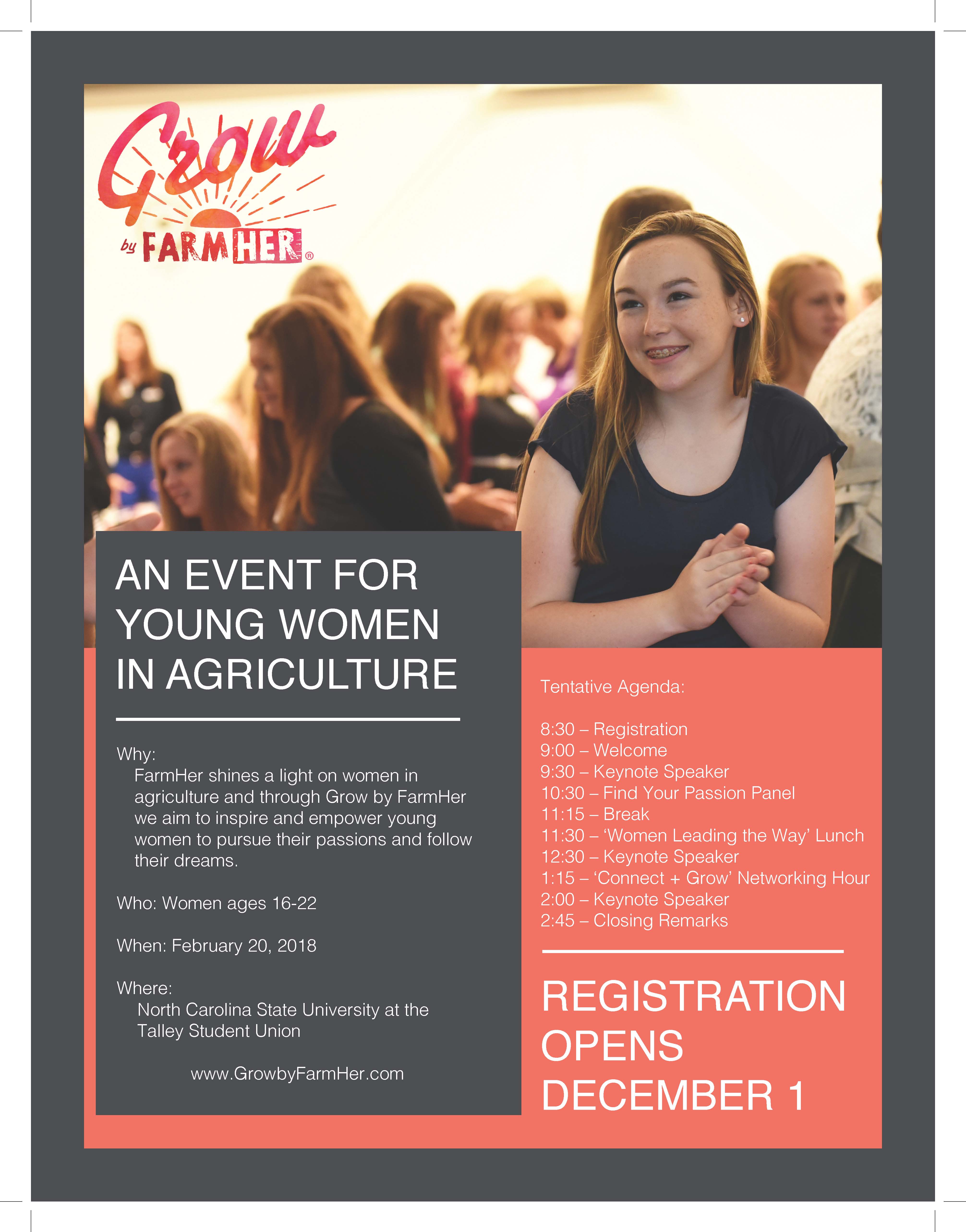 Through Grow by Farmher, attendees will experience empowering and educational speakers, be introduced to skills needed to be successful leaders and receive the encouragement and inspiration needed to grow as young women in the agriculture industry. This unique event is an investment in the future of agriculture, as attendees will become tomorrow's producers, business owners, and industry leaders. Stop one of the multi-state tour will be at North Carolina State University on Tuesday, February 20th. Learn by by clicking here. Tickets are on sale now and seats are limited.