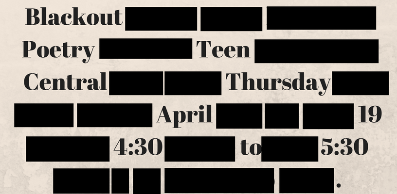 Drop into Teen Central Thursday, April 19 from 4:30 to 5:30 pm to try your hand at Blackout Poetry.