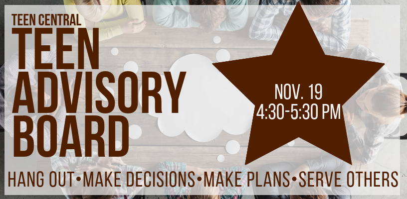 The Teen Advisory Board is a group of teens who meet once a month with the Teen Services Librarian. They advise the Teen Services Librarian on Library programs and materials for teenagers. This is a chance for teens to tell the Librarian what they want from their Library.