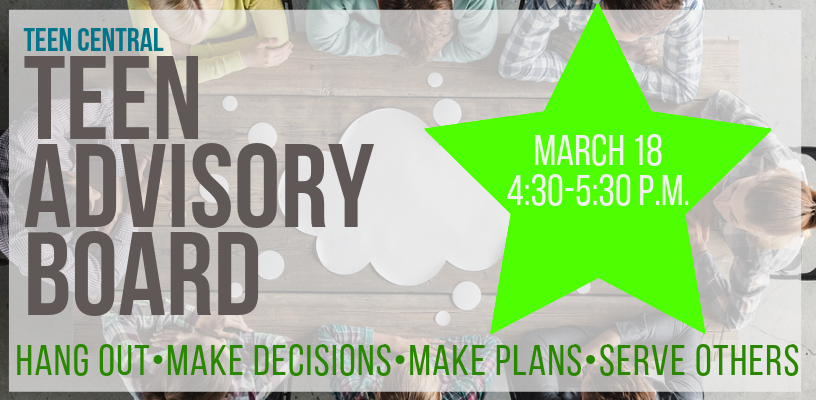 The Teen Advisory Board is a group of teens who meet once a month with the Teen Services Librarian. They advise the Teen Services Librarian on library programs and materials for teenagers. This is a chance for teens to tell the Librarian what they want from their Library.