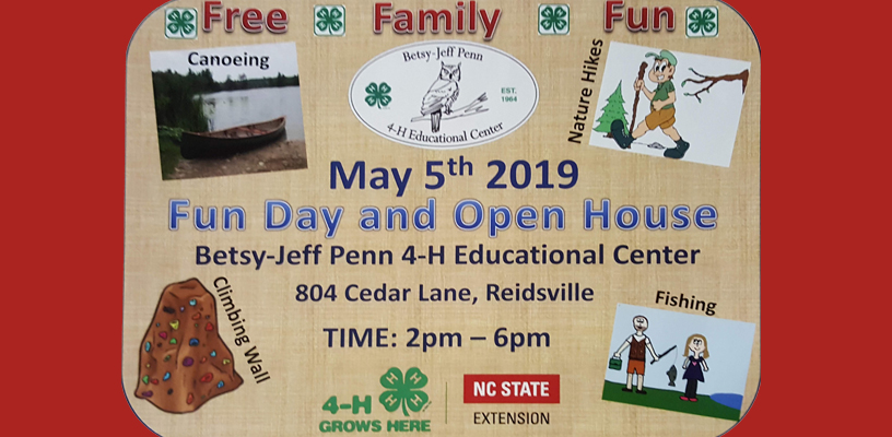 Travel to Betsy-Jeff Penn 4-H Center on 4-H Road in Reidsville, NC on Sunday, May 5, and see what 4-H camp has to offer! There will be opportunities for canoeing, hiking, rock climbing, archery, fishing and more at no cost! This event is from 2-6 p.m.