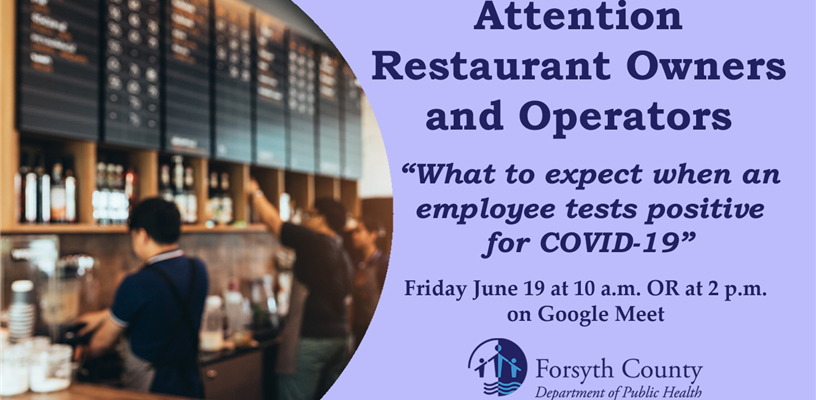 On Friday June 19 at 10 a.m. at 2 p.m. you can learn more about what to expect when an employee tests positive for COVID-19. Hear from the Communicable Disease Nurse Supervisor and the Food, Lodging and Institution Program Supervisor during a live video conference. You can call in by phone or connect through the video conferencing link and an opportunity for questions will be provided at the end of each session. Each session will be recorded and shared through the Forsyth County Department of Public Health’s Facebook page.