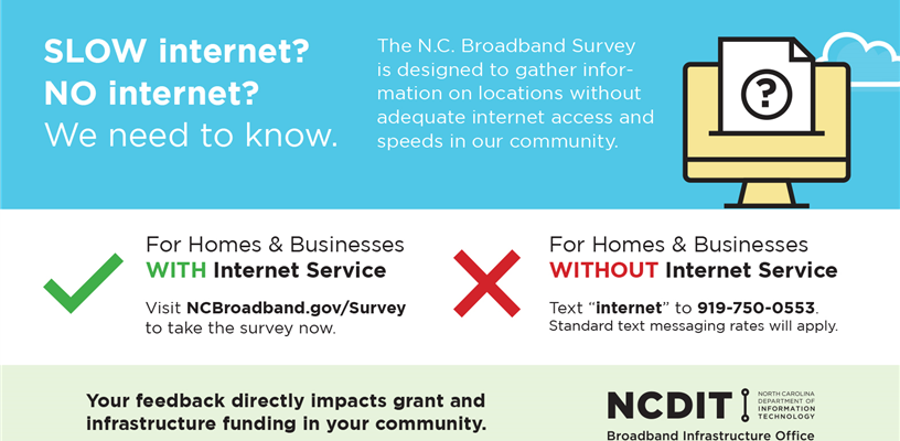 For Homes & Businesses Without Internet ServiceTo report locations without internet service, participants can take the survey by phone. Residents without internet service but with phones capable of text messaging can text “internet” to 919-750-0553. Standard text messaging rates will apply.