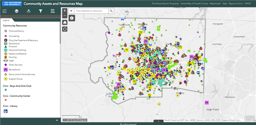 Service providers can contact FROST’s Amanda Clark at clarkac@forsyth.cc or 336-703-3175 or Partnership for Prosperity’s Asia Pepper at asia.pepper@uwforsyth.org or 336-721-9361, if they want to be listed on the map, or if they want to access the Provider version of the map that includes layers like Food Deserts, Brownfields, and census tract data.