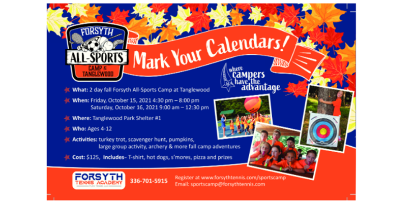 Forsyth All-Sports Camp at Tanglewood is offering a fall sports camp on Friday afternoon on October 15th and Saturday morning, October 16th. There will be hayrides, a pumpkin patch, camp games, large group activities and much more. Mark your calendars and register at forsythtennis.com/sportscamp. Don't miss out on this exciting event!