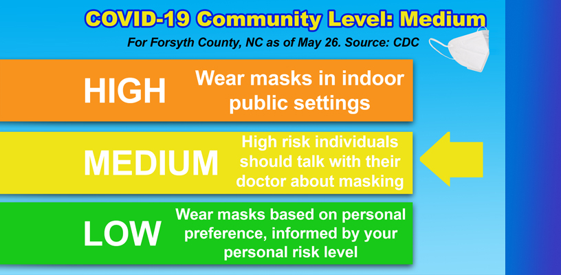 The Centers for Disease Control (CDC) has updated its County's COVID-19 Community Level for Forsyth County to Medium.