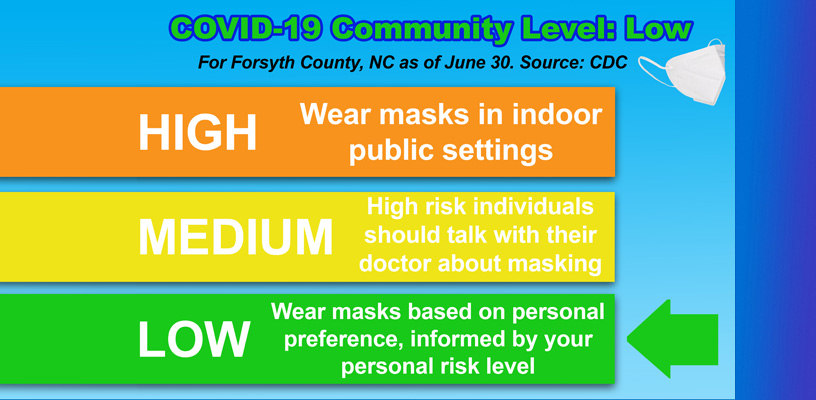 The Centers for Disease Control (CDC) has updated its COVID-19 Community Level for Forsyth County to Low.