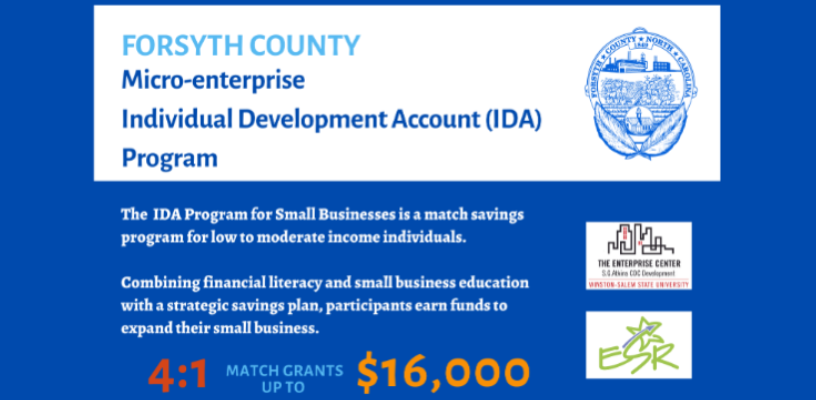 Apply today for the 2023 Forsyth County Micro-Enterprise Individual Development Account (IDA) Program. Businesses receive financial literacy education provided by Experiment in Self Reliance (ESR) and small business training provided by S.G. Atkins CDC. To date, the Micro-Enterprise IDA program has invested over $61,000 in matching capital to participating businesses.