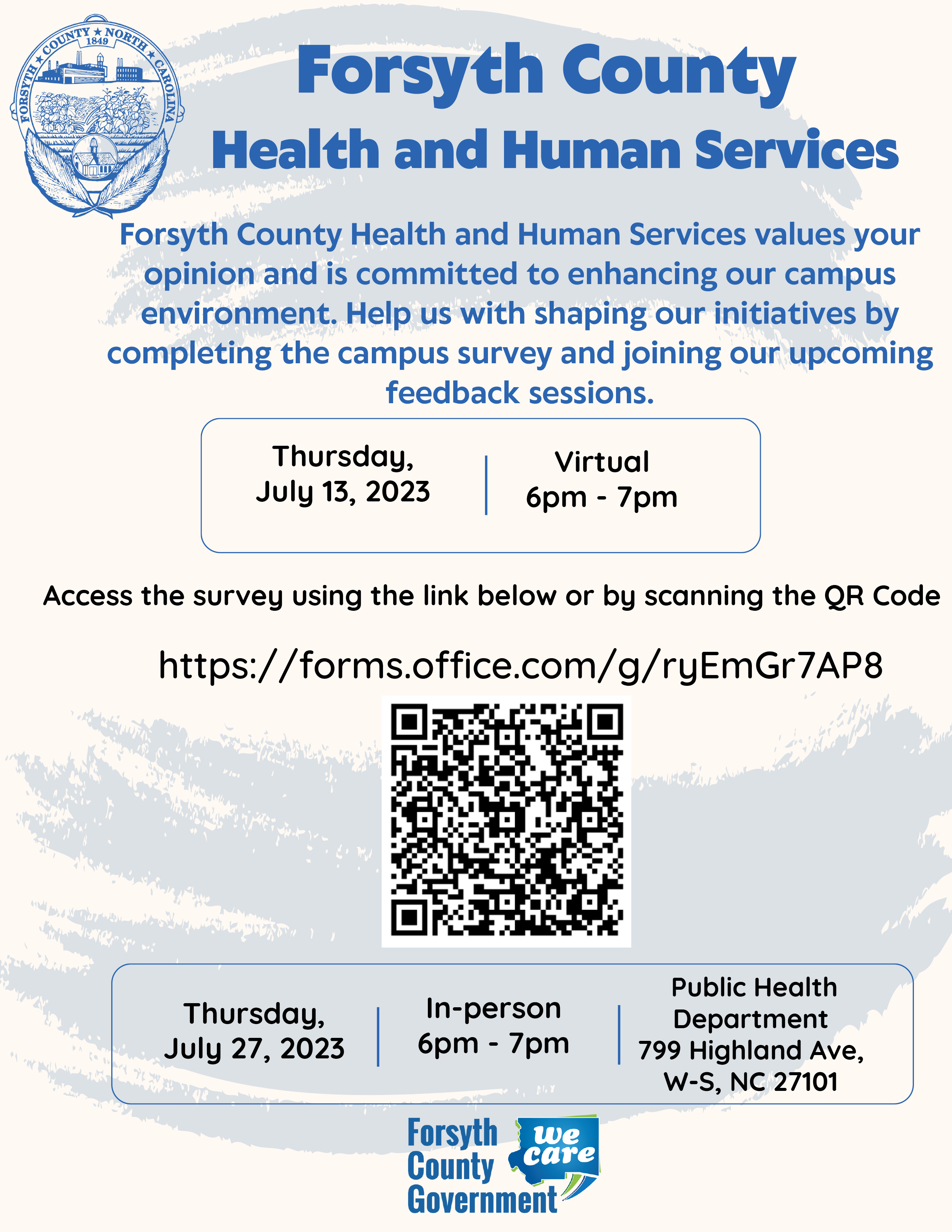 Forsyth County Health and Human Services (HHS) values your opinion and is dedicated to continuously enhancing our campus environment. We invite you to participate in an online survey as part of our ongoing efforts. Your valuable insights will help shape our future initiatives.