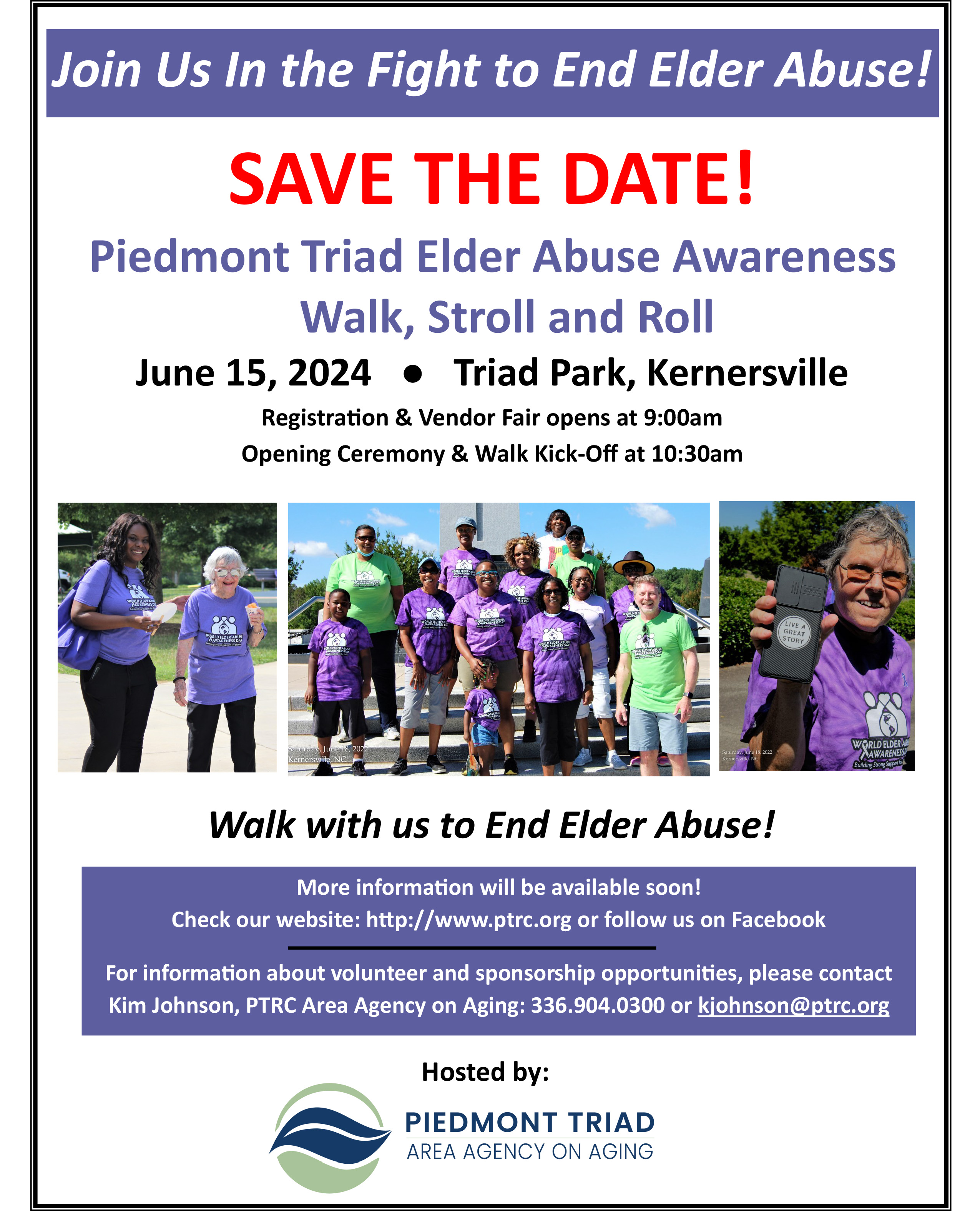 The Piedmont Triad Elder Abuse Awareness Walk, Stroll and Roll will take place June 15 at Triad Park, 9652 E. Mountain St, in Kernersville. Registration and a vendor fair will start at 9 a.m. The opening ceremony and walk kick-off will be at 10:30 a.m.