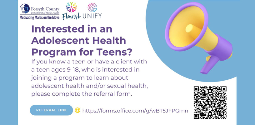 FCDPH's Adolescent Health Programs are officially accepting applications for the 2024-2025 school year. Flourish, Motivating Males on the Move (M3), and Unify will each be accepting 25 participants each and each program will run from September 2024-June 2025. Along with health education, all programs provide free transportation, snacks, activities, games, and field trips to participants throughout the year. If you are interested in receiving more information or applying, please fill out the referral form using the link or QR Code in the flyer. Enrollment applications can also be found at https://forsyth.cc/HHS/teen_services.aspx (Enrollment form & transportation waiver required). If you have any questions, please reach out to the Adolescent Health Coordinator at