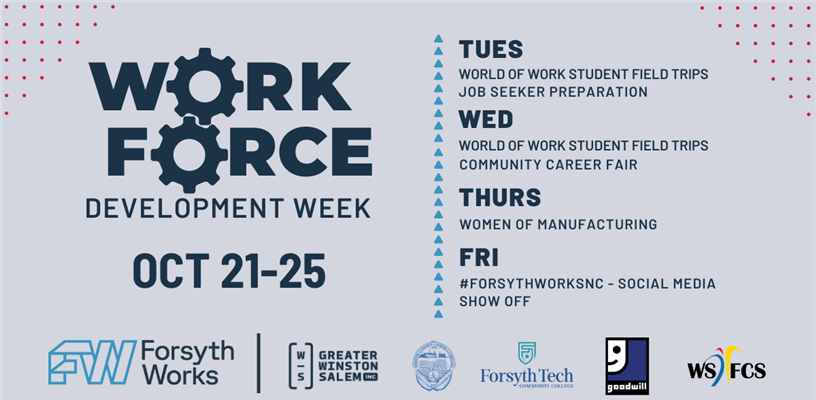 We are excited to announce Workforce Development Week in Forsyth County! The week of October 21-25 will feature numerous events for job seekers, employers, and students hosted and presented by Forsyth Works partners.