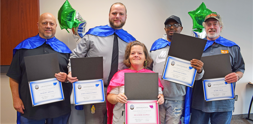 The ceremony celebrated five graduates who have been in recovery and have not incurred any new criminal charges for at least a year. To go along with the “SUPER” theme, graduates wore capes as they marched down the aisle.