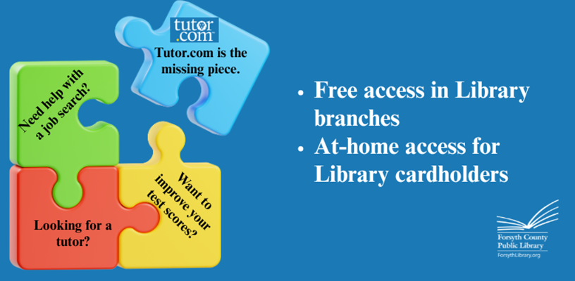 Forsyth County Public Library offers free access to Tutor.com over personal and public computers operating on the Library’s Wi-Fi network, and library cardholders can access the services 24/7 from anywhere, on any device with their card number and PIN. WS/FCS students who don't have library cards can use their Student ID as the library card number and the last four digits as the PIN.